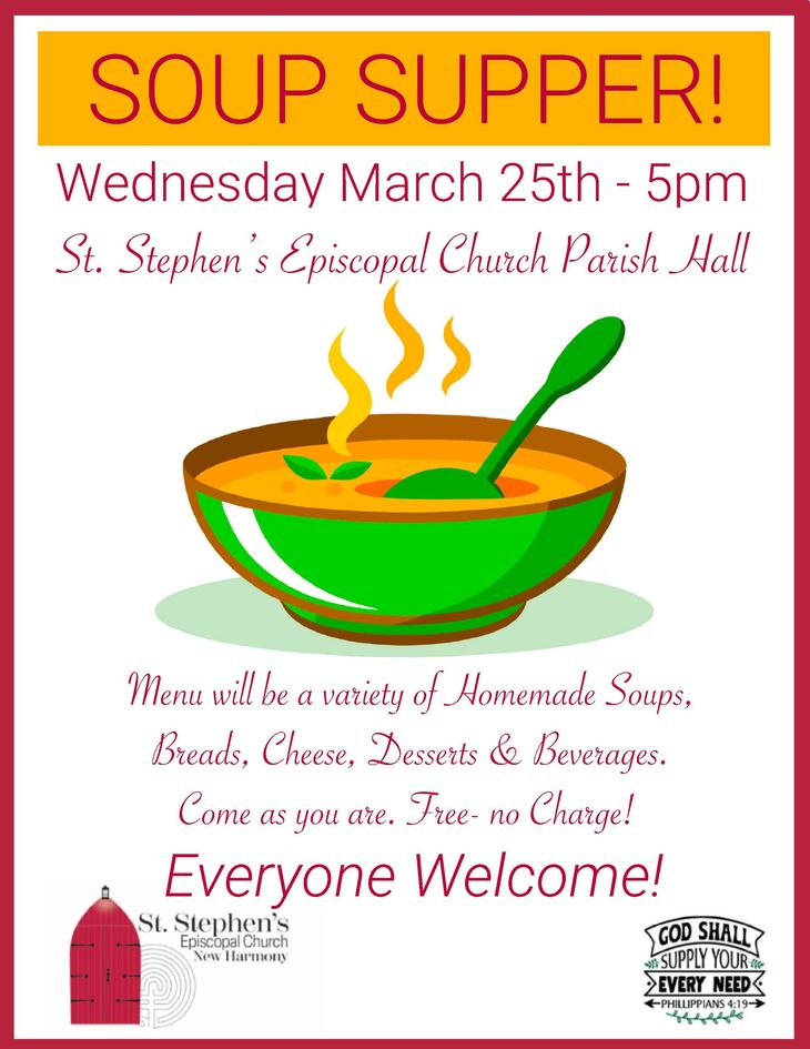 - SOUP SUPPER, Wednesday, March 25th at 5:00 p.m. Please contact Ken Meyer for more information.